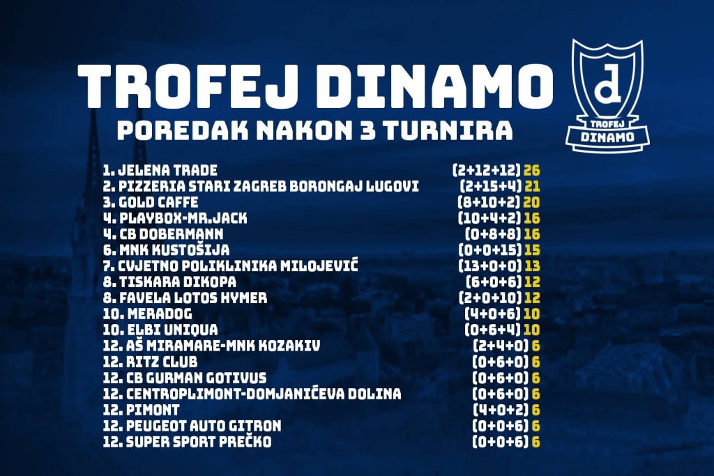 Treći turnir Trofej Dinamo je odlučen tek nakon penala – glavni junak je najbolji goman Kristijan Cingulin, koji je obranio 2 udarca i KMN Kustošiji donio pobjedu proti Jelen trade, koja tako gubi na penale 2. put zaredom. Utjeha joj je najbolji strijelac, Sadat Ziberi, a igrač je iz ekipe osvajača turnira Mihovil Prgomet. 3. mjesto za Lotos Hymer Favela, četvrto za CB Doberman.